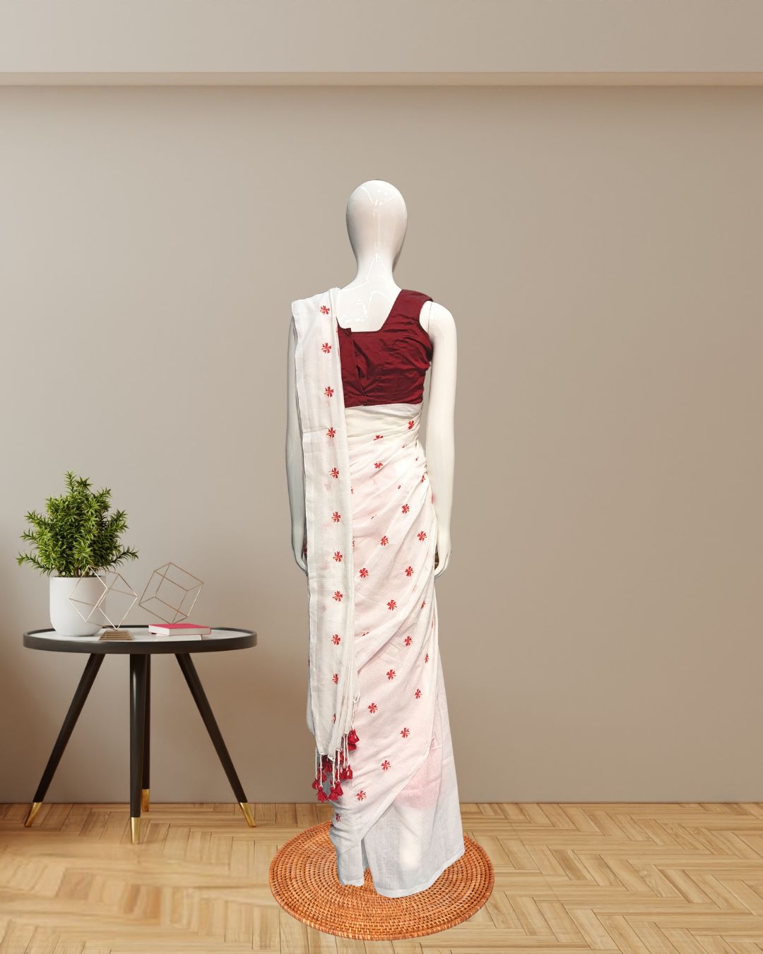 Graceful and earthy, this handloom saree features delicate Parijata (night-flowering jasmine) motifs that celebrate nature through traditional weaving.