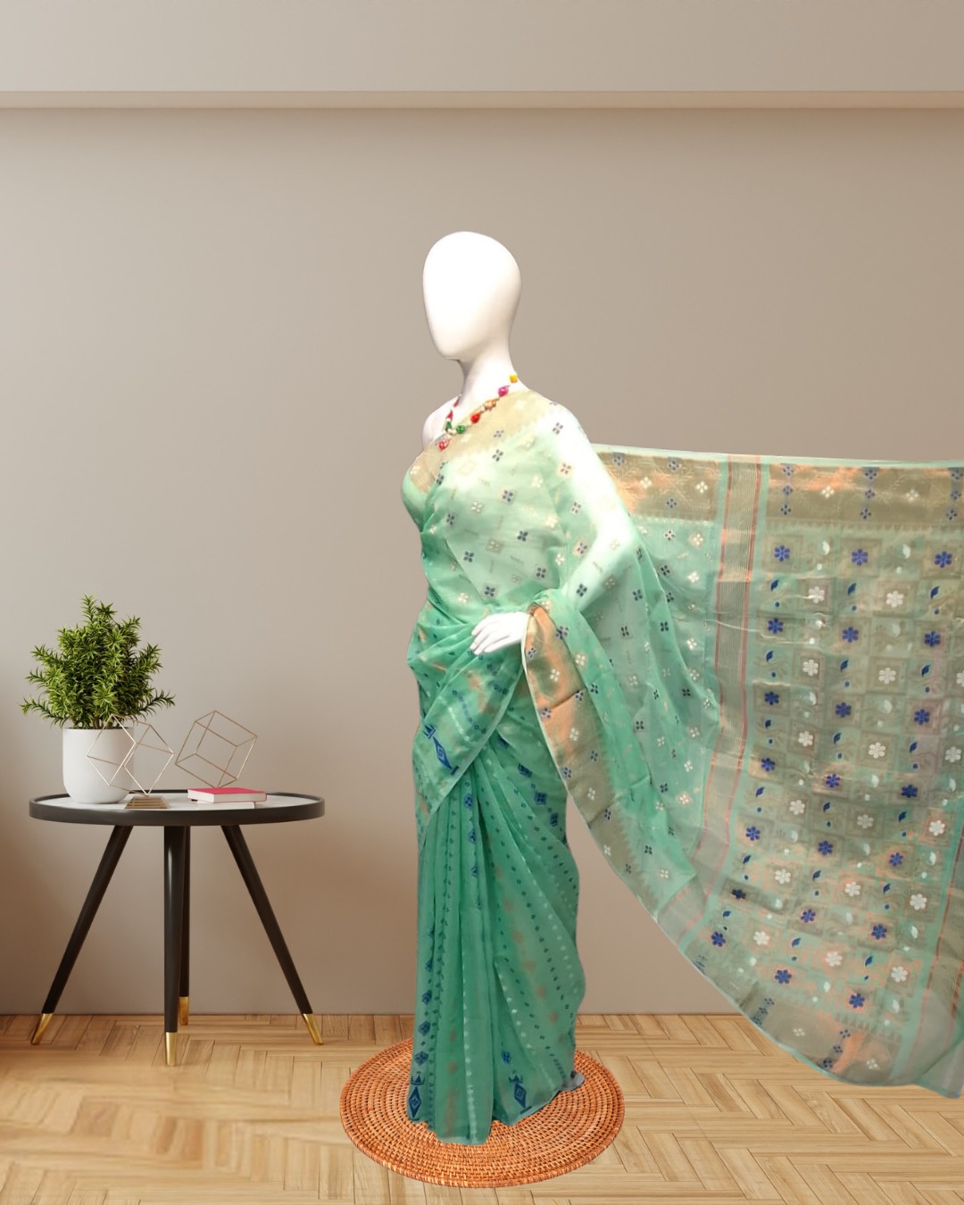 Elegant mint green saree with copper zari motifs and included blouse – perfect for festive and semi-formal occasions