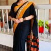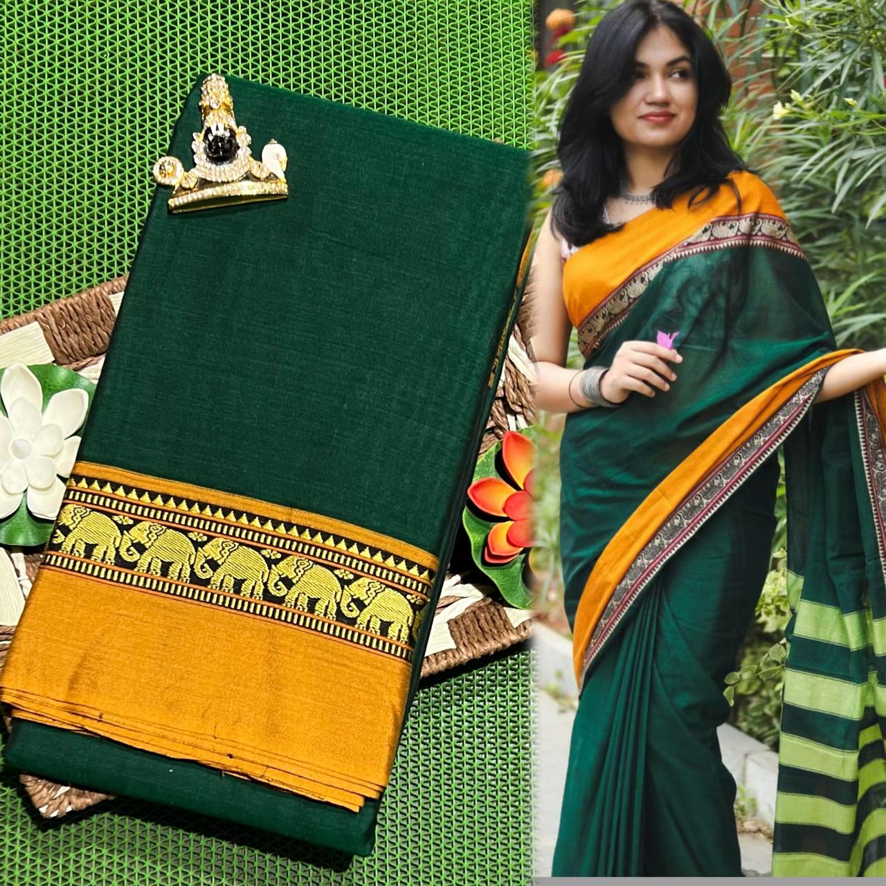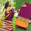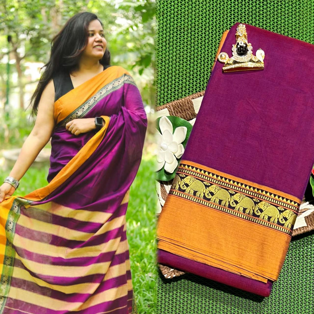 🐘 Features a small elephant border, 🤎 striped pallu, and 💜 running blouse piece.