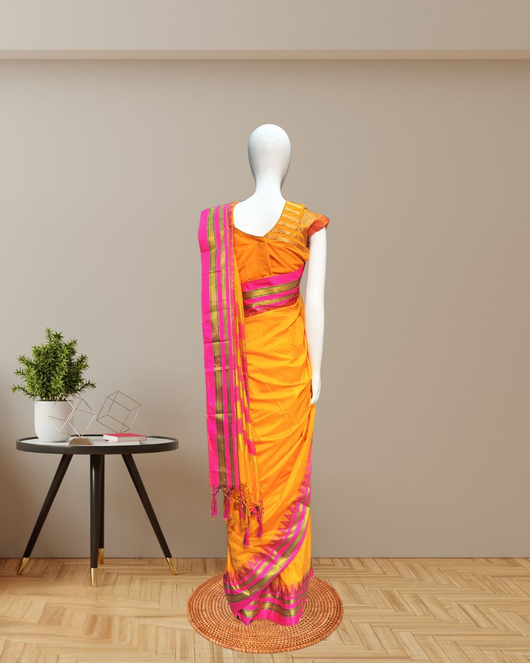 This cotton silk saree features a classic temple border, blending softness and shine for a timeless traditional look perfect for festive and formal occasions.